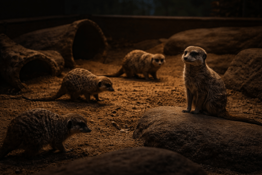 The meerkat enclosure was halfway down the row. Open-fronted behind glass, sand and stone arranged into something that tried to imitate a place much larger than it was. Heat lamps cast a false sun over burrows and raised mounds.
